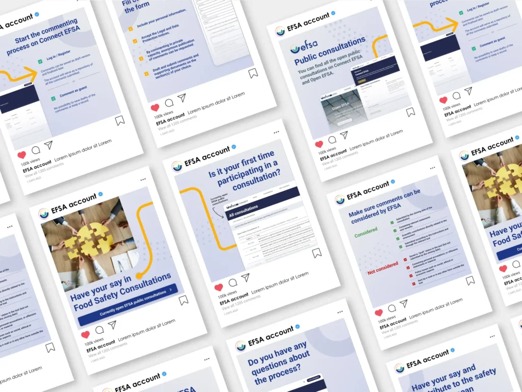 Pour accompagner la publication du toolkit, nous avons décliné plusieurs visuels à destination des réseaux sociaux : carrousels, images clés, accroches graphiques. Ces visuels ont permis à l’EFSA de communiquer de manière percutante et engageante sur l’ensemble de ses canaux. Un flyer a également été conçu pour synthétiser les points essentiels et favoriser la diffusion sur des événements ou en version imprimée.